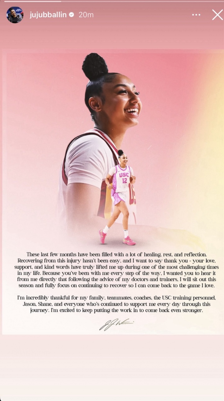 09月29日讯 2027年WNBA状元秀热门人选,NCAA女篮球星,南加州大学王牌朱朱-沃特金斯今日在社交媒体上宣布,自己因伤将缺席整个2025-26赛季...