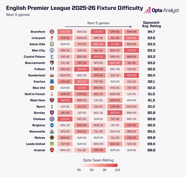 Opta解析英超未来5轮难度:阿森纳最轻松,利物浦难度第二高